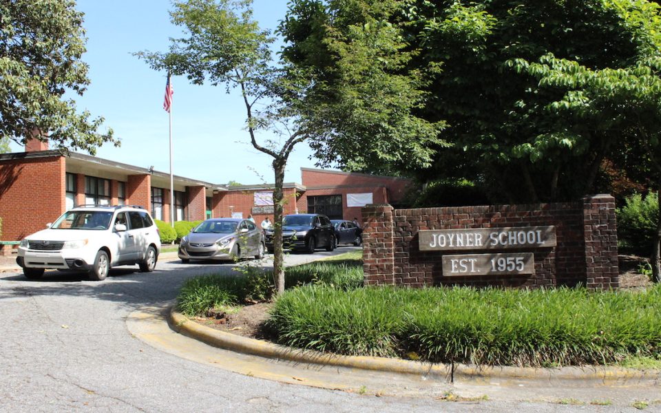 At Joyner, a few teachers and the principal stood outside, as cars drove around the circular driveway.
