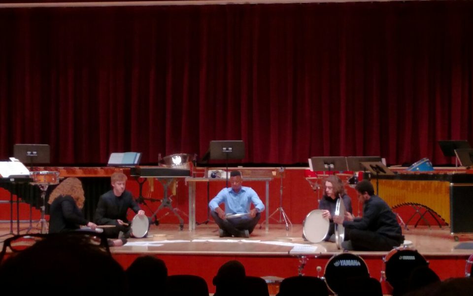 Four soloist drummers of UNCSA’s high school percussion ensemble sat down at the kits and performed composer John H. Beck’s 1999 arrangement for drum set. The call-and-response piece showed the soloist’s chops on drum set and culminated with a smooth rendition of the difficult and renowned snare pattern played by drummer Steve Gadd for Paul Simon’s “50 Ways to Leave Your Lover.”