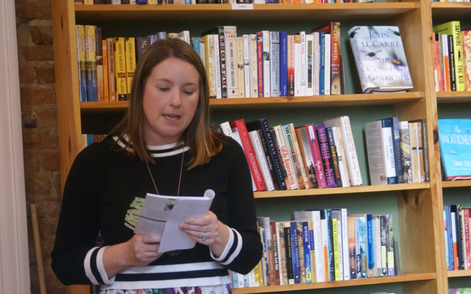 She stepped out from behind the podium and stood in front of one of the shelves of used books that lined the reading space. She flipped pages sporting lime green sticky notes as she talked about the death of someone else’s pet snake in a poem she described as one of her “greatest hits.”