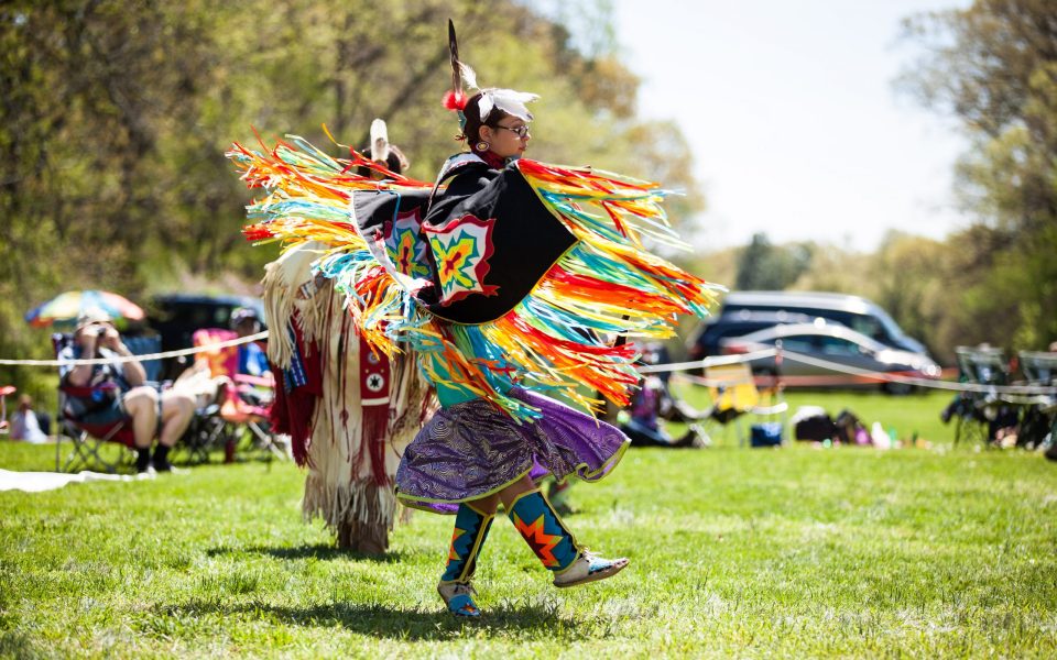 The four men sat in a circle, pounding on the circular drum in front of them with strong, swift motions. They chanted loudly into microphones that carried their voices over the lawn, merging with the sound of bells jingling from dancers’ garments just a few yards away.
