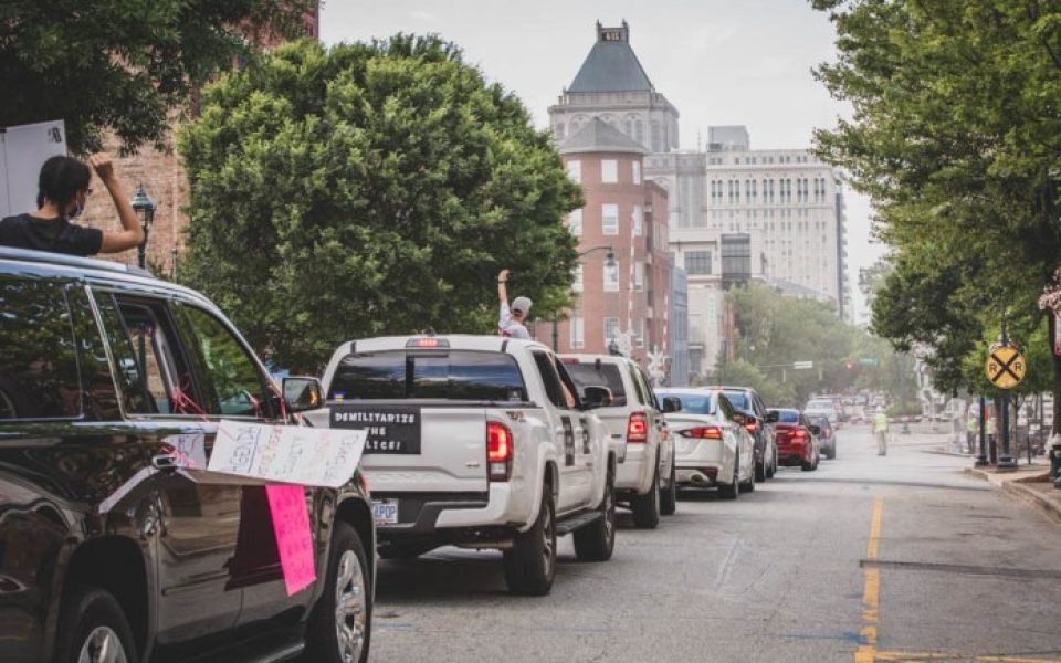 Protesters in Greensboro traded marching for driving and chanting for honking on Tuesday evening in a processional for black lives. The event began in the Union Square Campus parking lot at the corner of Gate City Blvd. and Elm St. and made its way through downtown and alongside NC A&T campus all the way to Maplewood Cemetery where four of the five individuals killed during the Greensboro Massacre are buried. Triad City Beat did a livestream of the event on Facebook which can be viewed here.