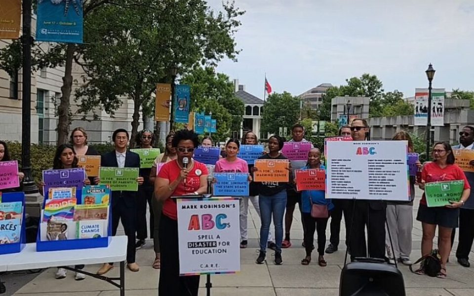 Members of the Coalition Against Mark Robinson’s Extremism (CARE) and education advocates held a press conference in downtown Raleigh to highlight what they said is an extreme Republican agenda, supported by Robinson, that threatens public education.