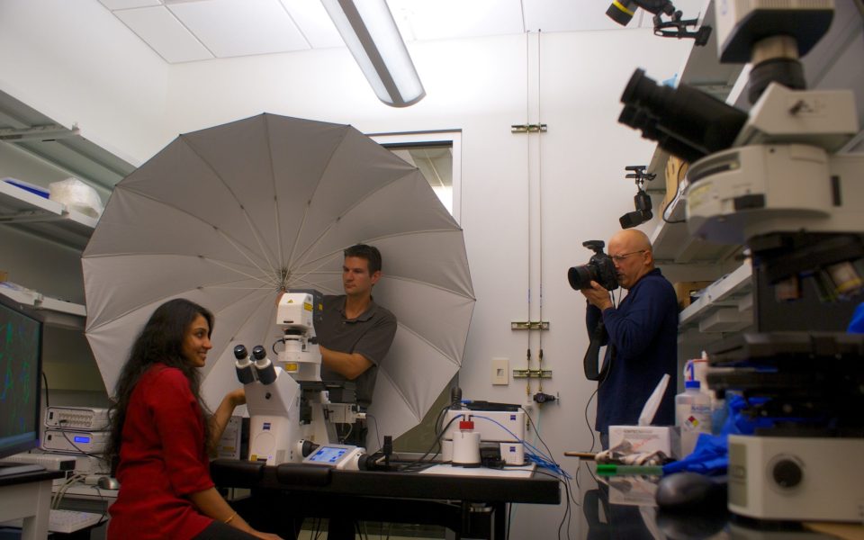 Carolyn Kuzmin, a communications manager at PR firm RLF Communications who would later write the accompanying profile of Ruparelia observed from a chair pushed into a corner of the small room, trying to stay out of the way in the limited space. With lights clipped to shelves, Wolford positioned a computer monitor near the edge of a desk behind his subject. The screen displayed a microscopic shot of Ruparelia’s research that looked like blue Christmas lights affixed to green smoke plumes, and Wolford made her sit uncomfortably close to another microscope in front of her.