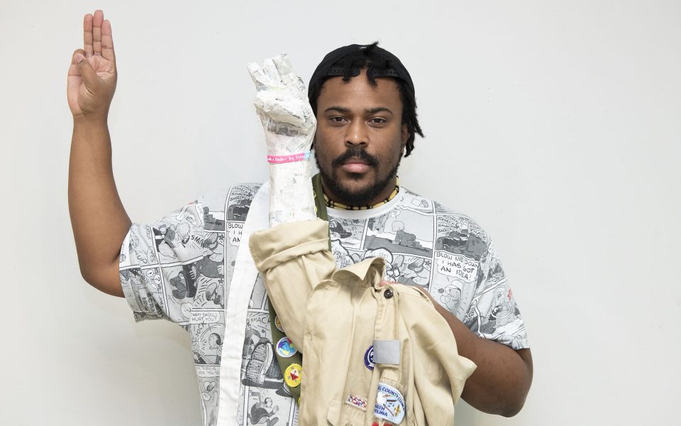 For the statues, I’m using some past certificates from school, letters and such. I’m also taking old clothes and attaching birthday cards, and we’re making them extensions of the clothes. They’re things I would look at when I was down or questioning myself. I also have an ocarina that my dad gave me on a trip. He would give me different Native American objects, and because I’m part Saponi, I’m still researching those objects.I’m looking at all of these objects and where the narrative is and building something out of that.