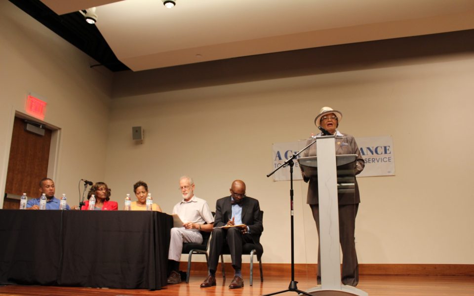 A panel of supporters — including Councilwoman Sharon Hightower, local NAACP first vice-president Viola Fuller, firefighter Fred Erwin and retired economics professor Larry Morse — offered up softball questions to presenters. Hightower went further in her initial comments, expressing her strong support for USPS and saying privatization would create a greater income divide and diminished quality of life rather than posing a question to Adams, who she said explained her defense of the postal service clearly.