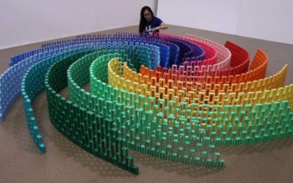 The hours, days and sometimes weeks of planning, stacking and building, comes to a fall in mere seconds. The grace of one plink! of plastic hitting the other, the inertia of the first tap, trickling, creating a wave of motion accompanied by piano tracks. It’s really a miracle that they topple the way they’re supposed to.
