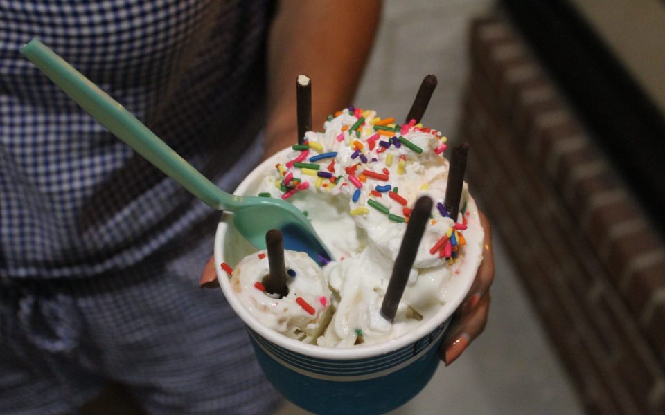 Most of the creations let you pick three toppings of your own. But after the warnings from two customers, we both chose pre-selected options for speed, choosing a cake batter special with whipped cream, Pocky (chocolate coated sticks) and sprinkles and a sweet & salty special with chocolate ice cream, pretzels, caramel and whipped cream. We could’ve been more adventurous and chosen variations with “unicorn bark,” Pop Rocks, cotton candy or Nutella, but we intentionally moved with speed.