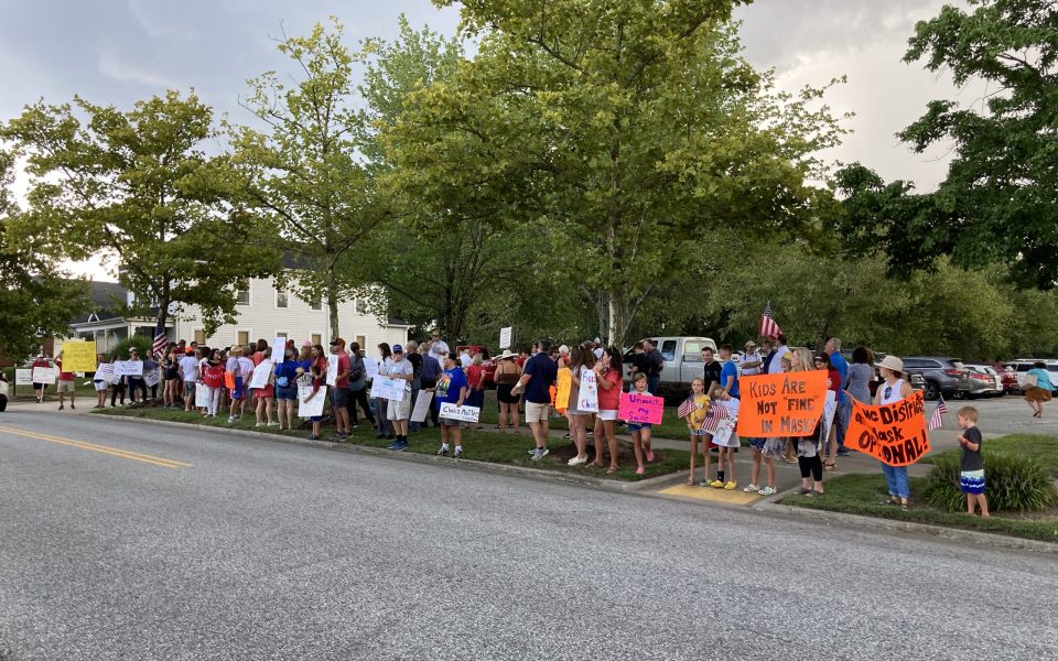 Featured photo: About 100 people protested the mask mandate outside of the Guilford County School Board building on Aug. 10. (photo by Sayaka Matsuoka)