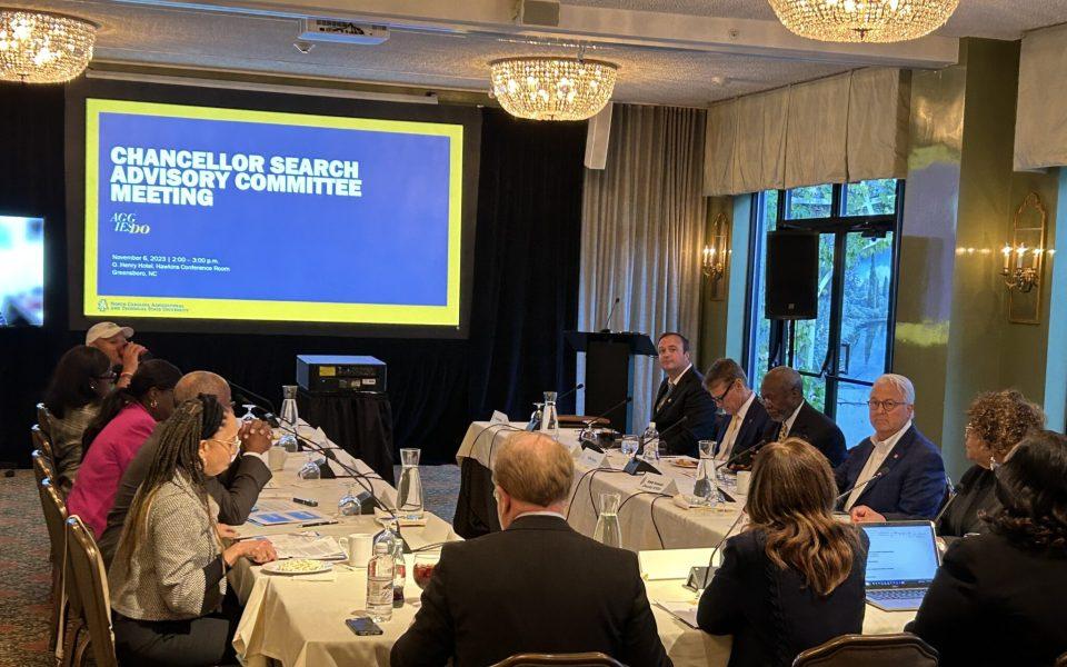Featured photo: Members of the chancellor search advisory committee meet in Greensboro on Monday. (photo by Joe Killian)