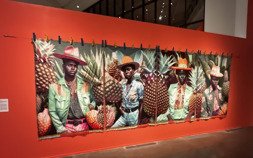 Imagine a planet called Atlantica, a paradise where Black people flourish, absent from the legacies of white supremacy, colonialism, and homophobia. Beautiful people, multifaceted in their gender expressions, are surrounded by giant, luscious pineapples and stare out across the land like tropical fashion models from the future. This is the Afrofuturist vision that Bahamian American artist April Bey has sewn together using colorful textiles and sherpa blankets, which hang off of the museum walls via big chunky clips.