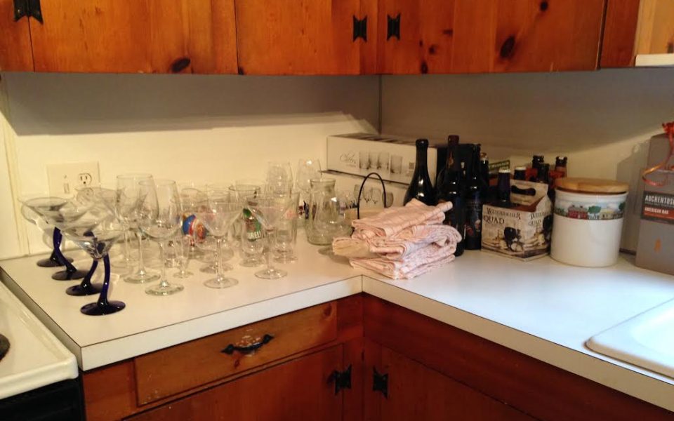 My now-husband’s dowry to the marriage included cocktail and champagne glasses, two-ounce shot glasses, cocktail shaker and related accoutrements and more rocks glasses. Our massive bar area displayed backlit bottles and glasses hanging underneath one of the shelves — an illusion that our barware did not also extend into three kitchen cabinets.