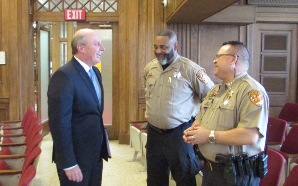 Photo: Sheriff Danny Rogers (center) shares a light-hearted moment with County Manager Marty Lawing before a press conference in the county commissioners chamber. (photo by Jordan Green)