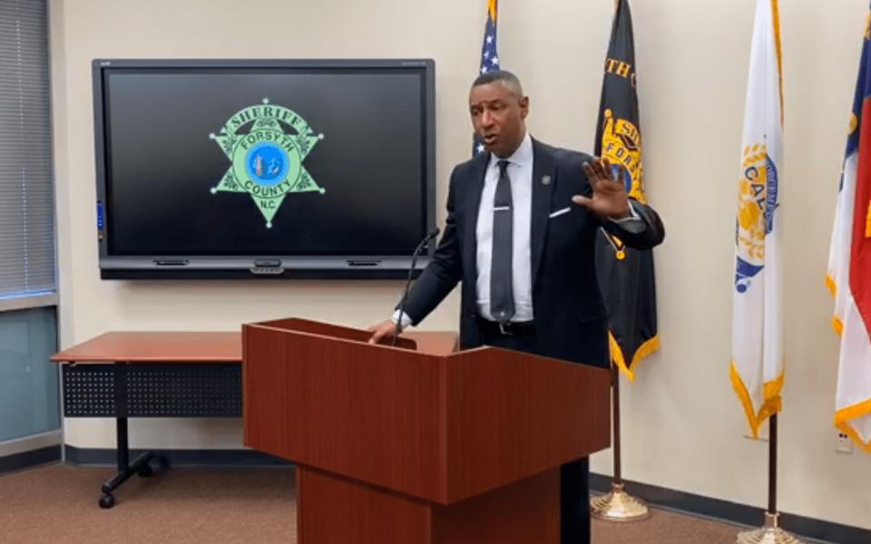 Photo: Forsyth county sheriff Bobby Kimbrough speaks during a press conference on March 17. (screenshot)