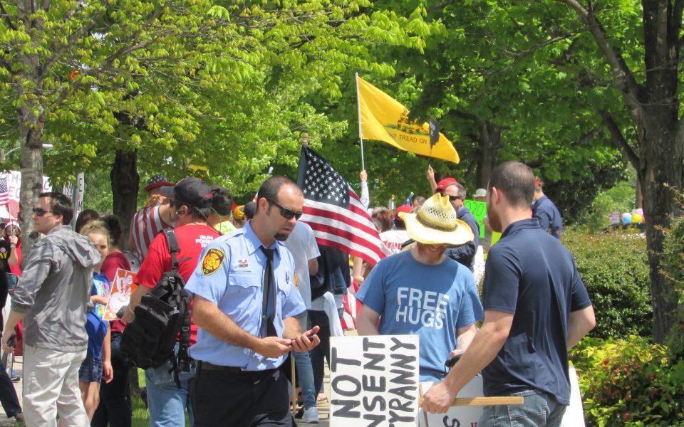 Tuesday’s Reopen NC protest — the second in what organizers say will be a weekly standing date — drew about 1,200, one organizer said. The protesters marched around downtown, and then convened on the sidewalk and in a parking lot near the General Assembly for a festive gathering that resembled a tailgate party. The gathering included families with children and at least one pregnant mother-to-be, and conspicuously violated a six-foot distancing rule mandated in a letter from Gov. Roy Cooper’s general counsel.