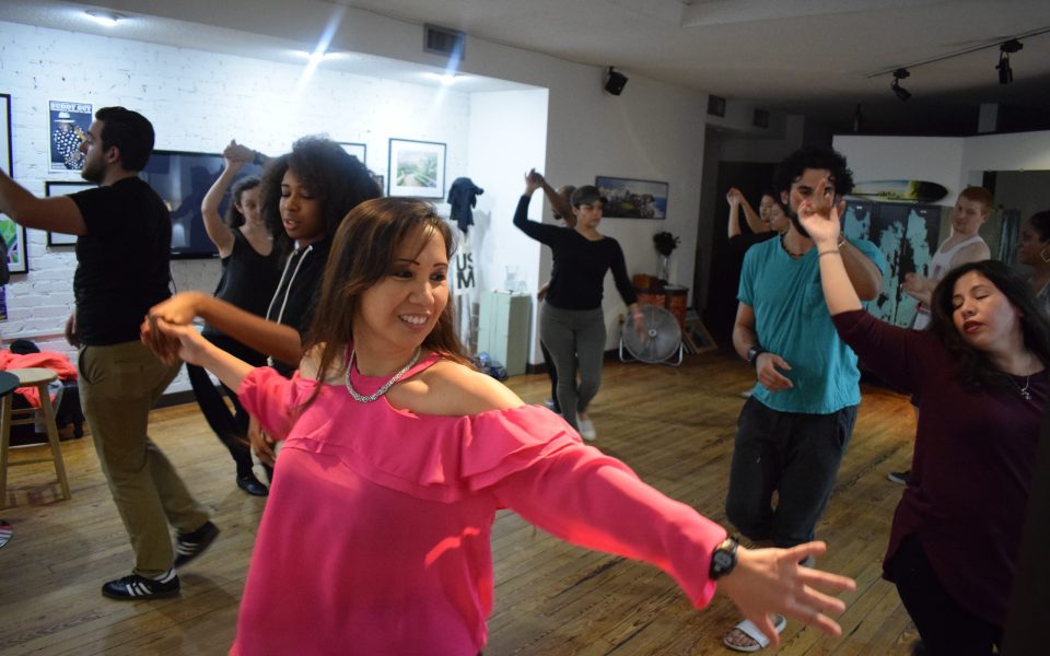 The devotees organically initiated the start of class with a rueda circle, a form of spontaneous call-and-response social dance where alternating dancers yell out calls, each of which denote different dance moves. As the circle spun tightly with a partner for a minute, everyone switched partners as the circle itself rotated.