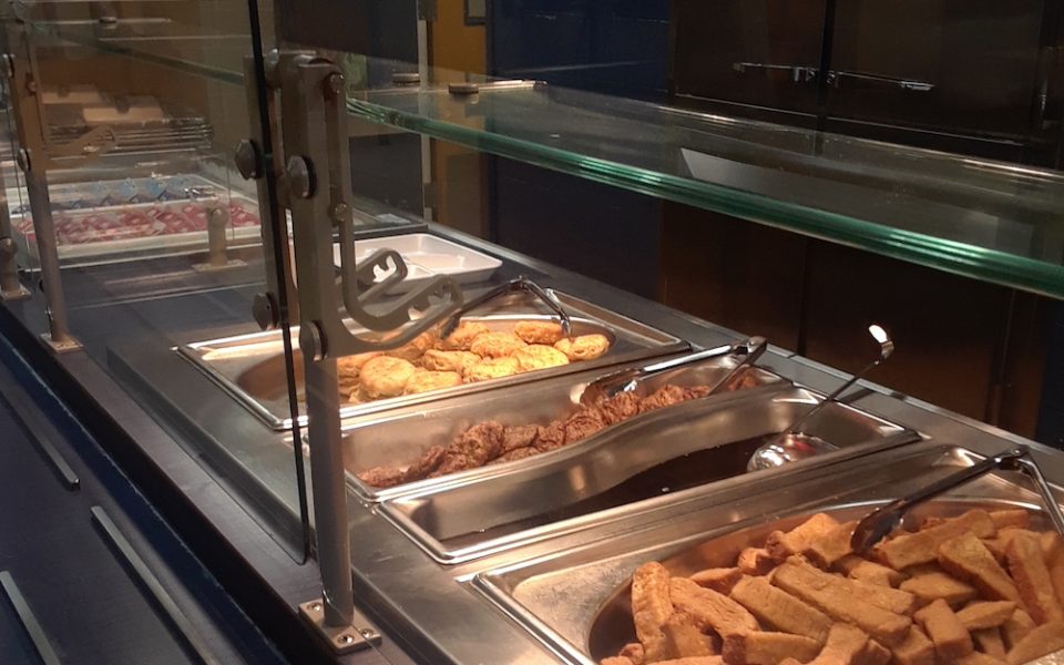 While the hallowed halls of school are empty, the kitchen is alive with activity. Hundreds of small Styrofoam cups stand like soldiers on trays as workers fill them feverishly with spoonfuls of warm green beans. Steam billows up from the hot pans filled to the brim with more pods. Garlic and paprika spice the air as the next set of pans are carried away, only to be replaced with more Styrofoam cups, more beans, and then more scooping. The low din of kitchen noises combined with the whirring of the powerful exhaust system fans punctuates laughter and chatter.