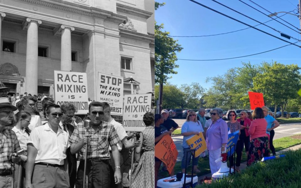 Featured photos: People outside of the Arkansas state capitol protesting the admission of the “Little Rock Nine” to Central High School in 1959 on the left. Take Back Our Schools members protesting critical race theory at the June 17 school board meeting on the right.