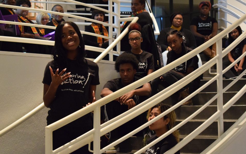More than 50 people found church in the art center as 12 teenagers and adolescents with Authoring Action performed spoken-word pieces from a descending stairwell and the Voices of God’s Children gospel choir sang African-American spirituals one floor above a captivated audience seated in bright white fold-out chairs.