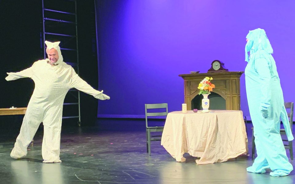 As the lights go up, the stage becomes a coffee shop stalked by a serial laptop thief looking for tables left unattended. He preys on those who ask someone, usually a stranger, to watch their stuff while they take a bathroom break. Not a quarter hour later, the same stage transforms an antique-looking den, where a child’s stuffed animal plans a runaway marriage with another. Quickly, the romance between patterned cat and dog morphs into a tale of heartbreak and betrayal.