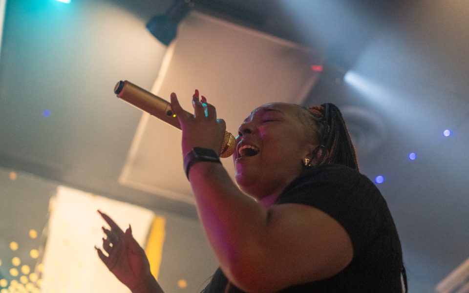 One night there’s a middle-aged man with glasses, locs past his shoulder and an alto saxophone strapped around his neck as he raps and dances around the room. Sometimes, he stops to cradle the instrument and slur melodic sixteenth notes or spontaneously backs up another performer.