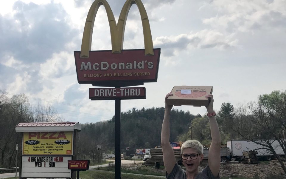 More pizza-seekers came in, waiting impatiently beside a sheet of pink posterboard that said “McDonald’s has pizza!!! Where are you from?” A woman in a denim jacket picked up the Sharpie and added her own details. She wore a giant pin that said, “I’d Rather Be Anywhere Than Here,” an odd sentiment for someone who’d driven from Fort Spring, W.Va. — 150 miles away — to eat at this specific McDonald’s.