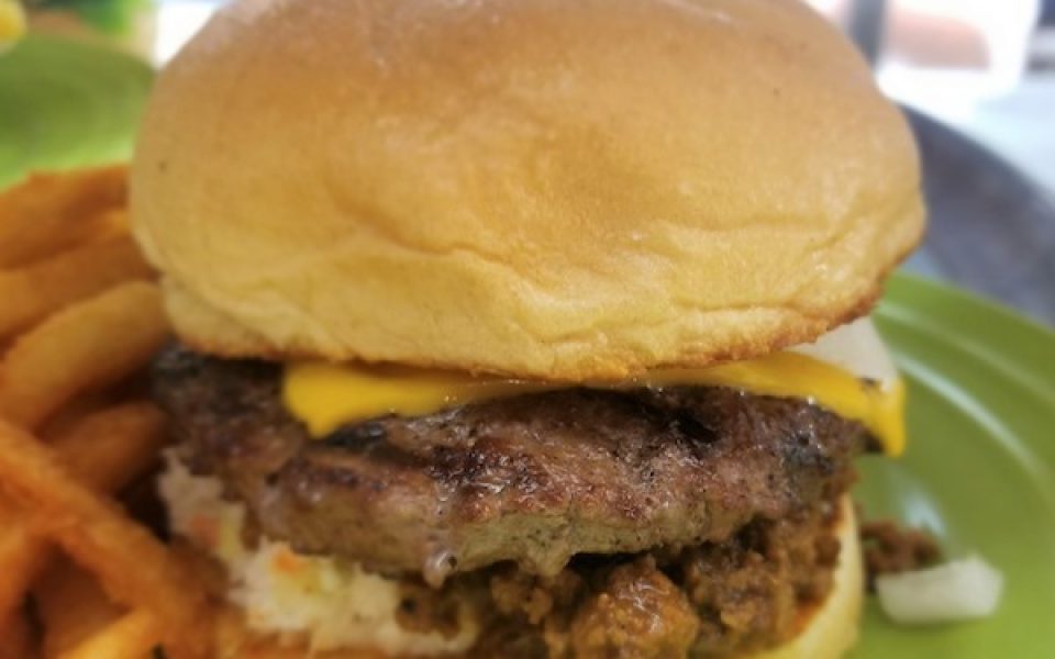 It’s coming back to us, that most quintessential of American dishes. Ground beef, courtesy of the domesticated cow, a triumph of agricultural civilization. The bun is a marvel of bread-making technology, a tiny loaf designed for a single purpose. We put cheese on them — American cheese, most of the time, which may not rank among the world’s great cheeses, but it’s ours, dammit. Atop that we may put whatever we want: ketchup, mayo, lettuce, mushrooms, special sauce, bacon… we’re Americans, and we want what we want. Sometimes we top our burgers with another burger, because that’s how we roll.