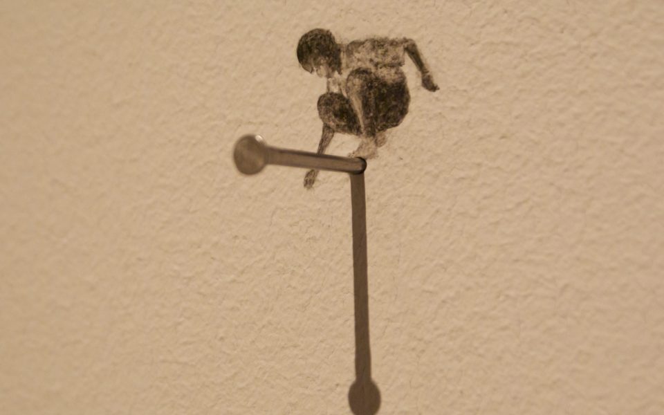 Shadows play a prominent role in Daily Measures, including one sticky note showing a man making shadow puppets or the actual nail’s shadow on the wall, but none more than an installation in the back of the exhibit.
