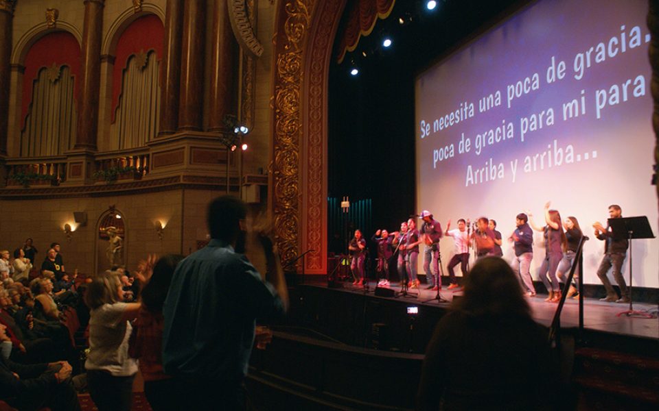 As the piano rings out the gospel-rock song, ASL interpreters translate the lyrics. A man with graying hair stands up to clap, while a small toddler seated beside him looks up from the popcorn box half his size in his lap and starts swaying back and forth.