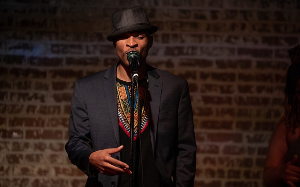 Clement Mallory, who’s engaged Poetry Café audiences from the Cabaret stage since its founding, is Universal Mathematics onstage. As he saunters toward the front-and-center mic, he introduces himself: “I’m a walking open mic, I’m a walking open mic, I’m a walking open mic…mic…mic…” The willowy poet sets his own pace, offering innuendos concerning “peachy attitudes, banana slick moves” and options for participation beyond swaying, snapping and clapping.