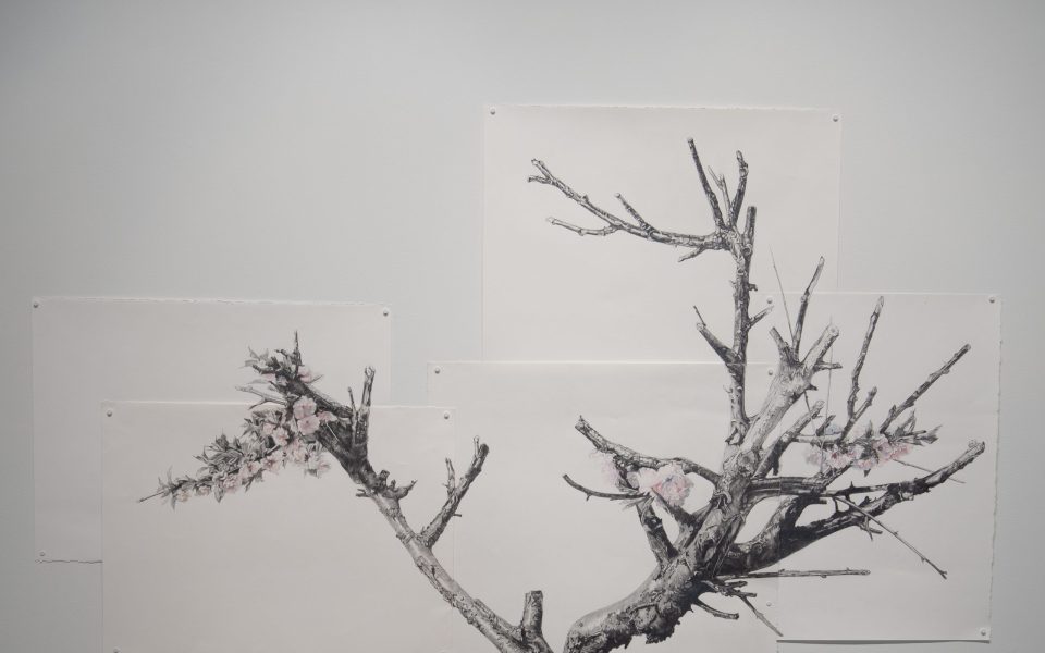 The framing of many ordinary images makes Kirouac’s process seem like a dissection. The only other color in the graphite drawings belongs to a set of flowers blooming on an otherwise bare tree. Despite stretching across five sheets, parts of the tree’s trunk and branches remain unshown.