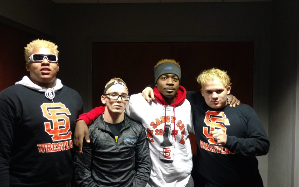 Indeed, fellow wrestler Michael Johnson wore a T-shirt labeled “The Saucy Seven” along with logos representing the school, the year and a tall bottle of sauce.