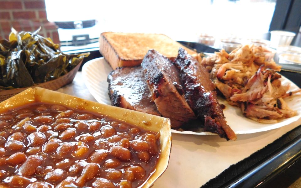 There’s even a “Mexi-que” section of the menu with pulled-pork tacos, taquitos and a barbecue quesadilla served with pico de gallo. Eight different types of meat and seven different sauces are served alongside 15 different sides in a restaurant that is one-third sports bar and two-thirds traditional table service.