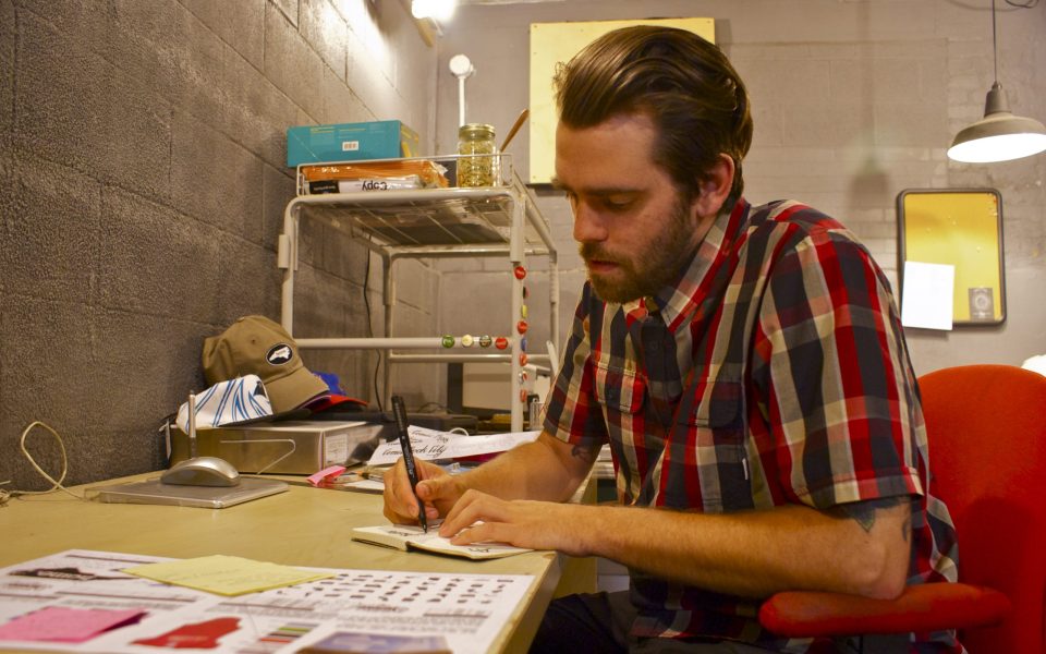 There’s all the band merchandise he’s designed for local groups like Torch Runner and Between the Buried and Me, or material for marquee events including a poster for Greensboro Fest or shirts for Free Comic Book Day. Some people would be more familiar with his work on display at a booth at Design Archives, including a poster reading “Only posers move to New York” or Greensboro T-shirts.