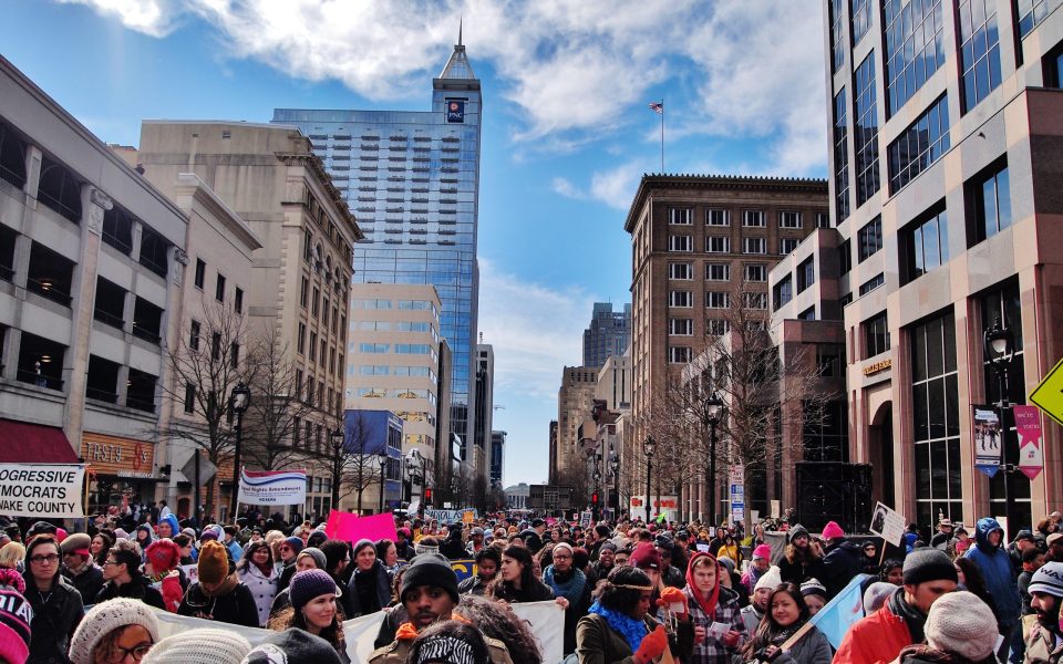 An estimated 3,000 people showed up for the Moral March in downtown Raleigh today. Cold temperatures didn’t keep many away. A plethora of progressive organizations and committees represented with substantial turnout of young people from colleges in the Triad and the Triangle. Greensboro writer and photographer Rebecca Harrelson documented the march with these photos.