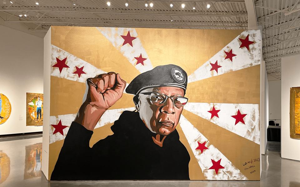 On the main wall as viewers enter the main gallery, Larry Little, dressed in all black, raises his right fist up in the air in a power salute. He wears glasses and his signature Black Panther hat atop his head as golden rays and white stripes with stars sprout from behind him.