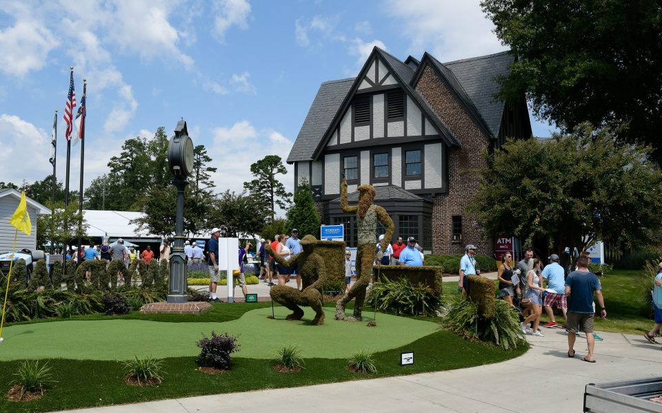 At Sedgefield, Kyte’s sculptures included two enormous pineapples that incorporated 300 1-gallon floral plants — augmenting Wyndham’s “Southern charm” theme — a logo reading “#WYNDHAMCHAMP” and two larger-than-life golfers who flanked a road that cuts through the course.