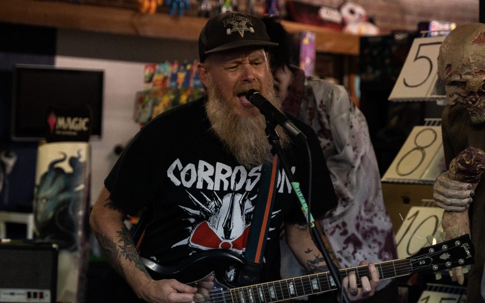 While members of headliner Rocket 77 nod their heads appreciatively in the background, the young acolytes cavort at the front of the stage, absorbing the lessons offered. Somewhere between the fourth and fifth songs, the guitarist from Orphan Riot changes into a black Totally Slow T-shirt in the bathroom of the comic shop. And now they’re moshing loosely, a kick dance with arms akimbo. One by one, they spin-jump off the edge of the performance platform. And then they each put a foot on the edge of the stage on front of Hicks and start headbanging.