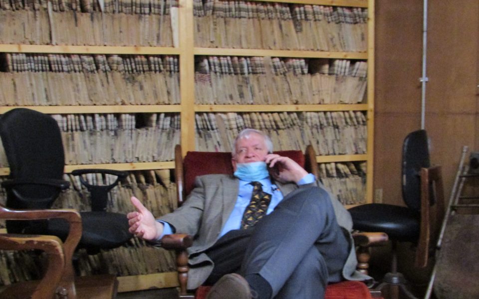 Publisher Tom Boney Jr. speaks on a cell phone with attorney Amanda Martin in the conference room of the Alamance News offices in Graham. (photo by Jordan Green)