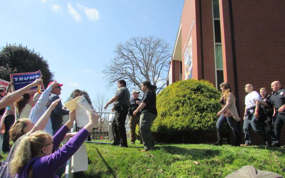 “A lot of times they’re kids and they don’t know where they’re coming from,” Trump said, as Olive, McCrae and four other protesters were escorted out of the building by Hickory police officers.