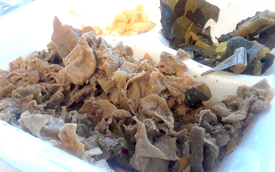 The small intestines of pigs are not easy to come by. Not only must they be cleaned, there is a thin, yet tough membrane that has to be peeled away from the lining before being chopped and boiled for up to eight hours in seasoned water. Its origins came from days of slavery. Overseers and plantation owners would keep the bacon, pork chops, loins and roasts of pork for themselves and toss the undesirable parts to the slaves like pig’s feet, ears, tails, brains and intestines.