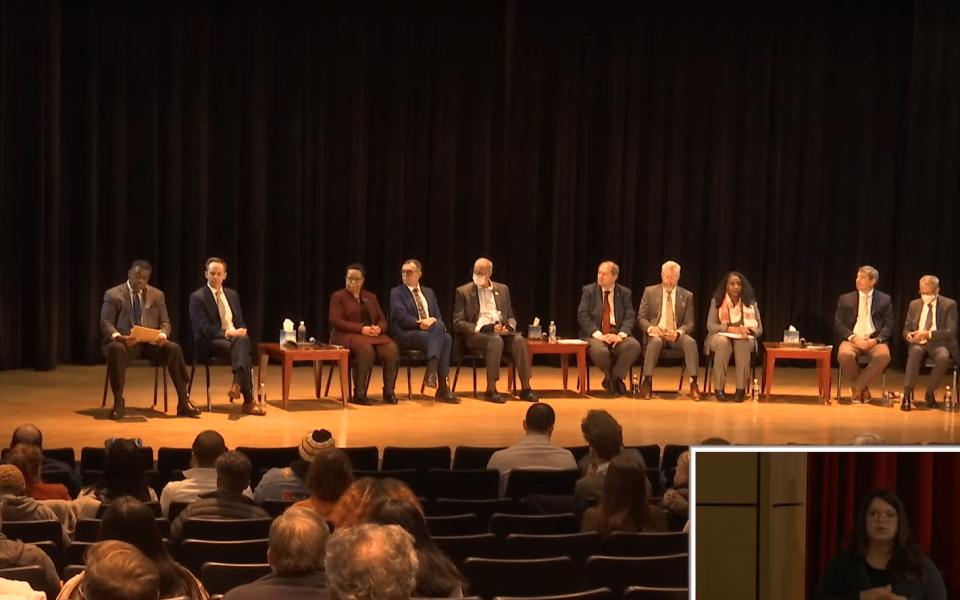 After the student made their remarks on Tuesday, none of the panelists responded to the assertion that administrators should take a pay cut.