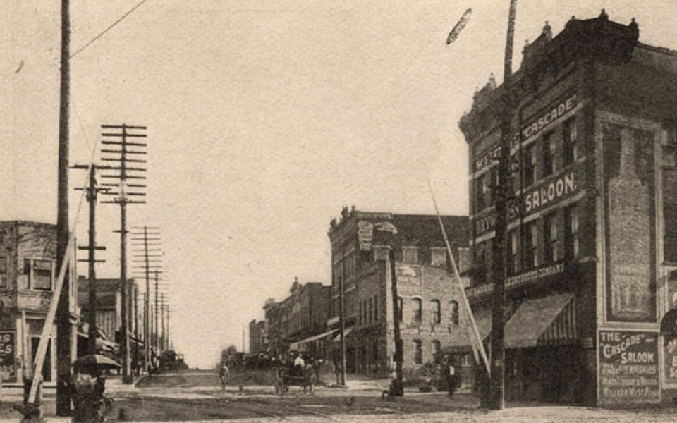 A view of Elm Street in Greensboro, looking north from the railroad tracks and Depot Street (now East McGee Street). The saloon on the corner is now occupied by Little Brother Brewing. (courtesy of UNCG archives)