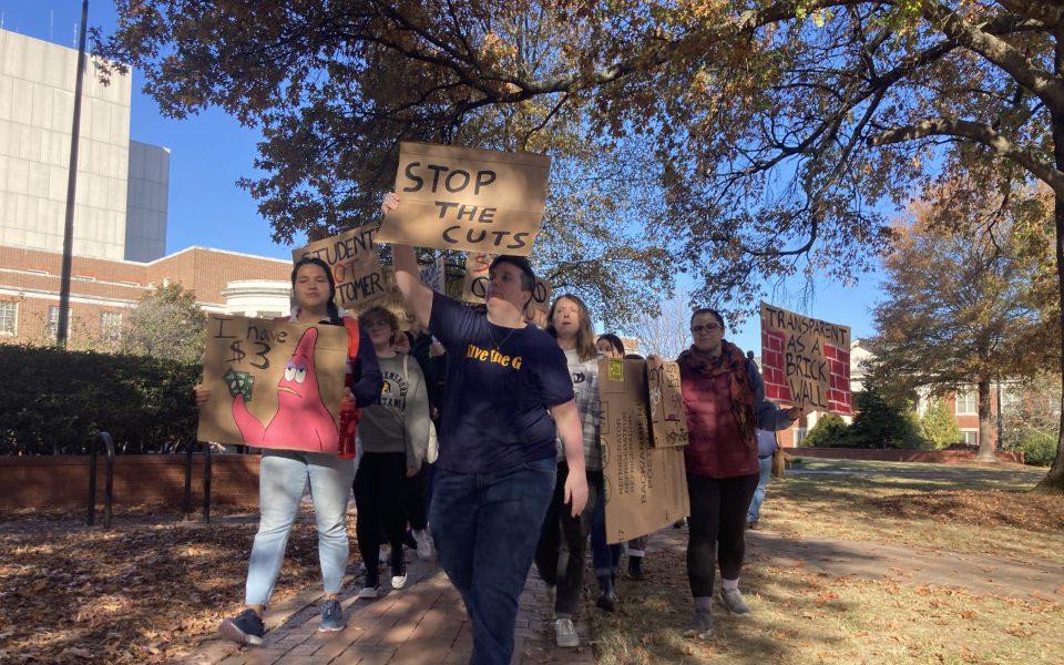 On Nov. 16, faculty and graduate students led a protest on UNCG’s campus in which they walked from Jackson Library down College Avenue, passing in front of the Alumni House where members of the UNC Board of Governors had gathered for a meeting.