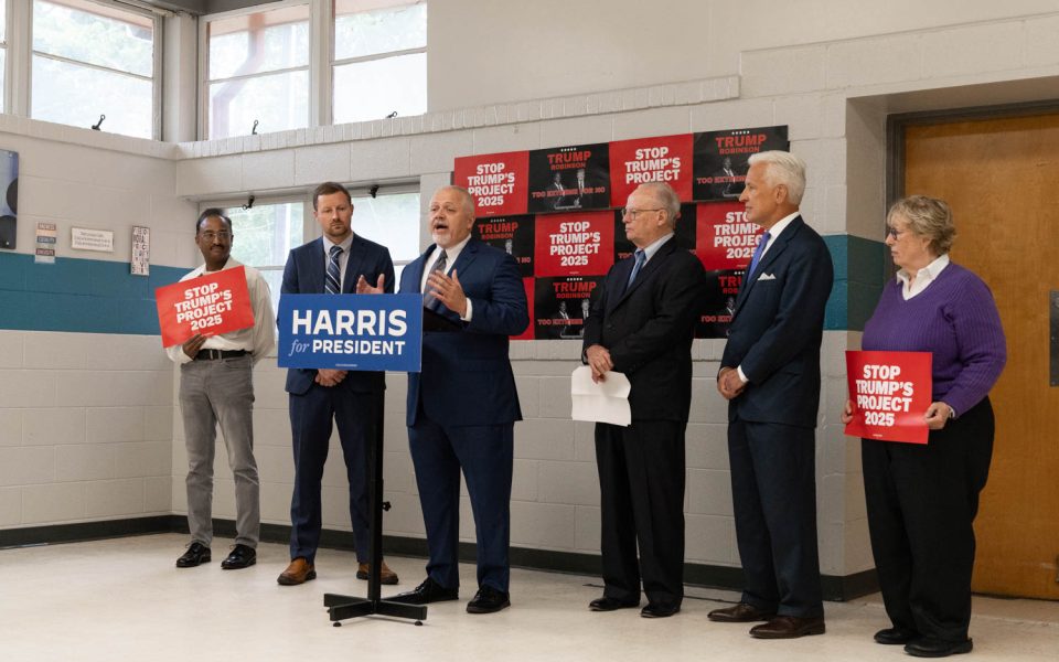 Featured photo: (L-R) Greensboro resident Gopal Sundaresh, former John McCain staffer Robert Brown, former GOP Rep. Denver Riggleman of Virginia, former NC Justice Bob Orr, Winston-Salem businessman David Daggett and High Point resident Beth Koonce held at press conference on Oct. 3 urging Republicans like them to vote for Harris over Trump. (photo by Carolyn de Berry)
