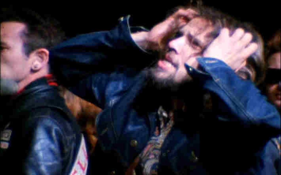 The footage of the festival itself — an apocalyptic scene of chopped-out bikes roaring through clusters of hippies in the desert and bikers wildly swinging sticks at concertgoers — is the ultimate depiction of a collective bad trip. The scenes of volunteers crawling over the landscape just before dawn with sound equipment, beer, even a mattress, seem almost Biblical, and then just before the closing credits, one sees human forms staggering away, almost seeming to cling to the earth like scurrying crabs, primordial creatures coughed up from the depths of hell.