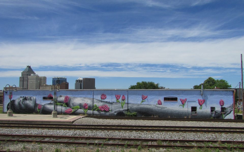 Of course, I’m talking about the expansive mural of a reclining female nude painted by Virginia artist Nils Westergard along the back side of AWOL Fitness. Situated in a location that’s both obscure and in the heart of the city, the painting maximizes the opportunity to surprise and delight through urban context. Viewable only from the east-bound Amtrak platform and CityView Apartments, it also showcases the iconic backdrop of the Greensboro skyline, such as it is (i.e. the Lincoln Financial Building and CenterPointe essentially).