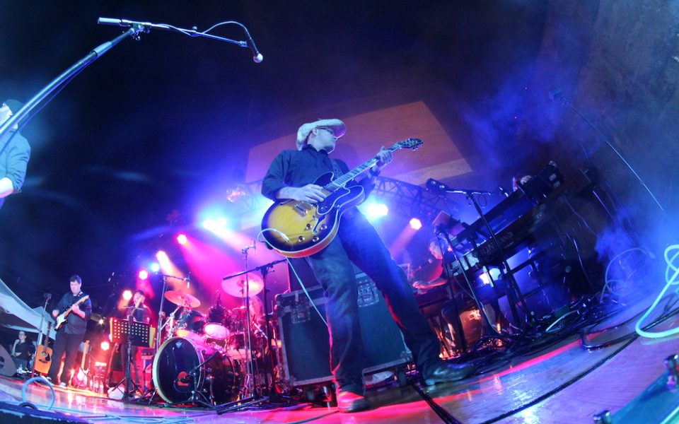 The dense crowd begins to quiet as fog rolls out from onstage, the smell of the synthetic cloud blending with that of pizza and beers. As the band and guest musicians begin, they often appear in the haze more like silhouettes or outlines than fully-formed people. The bricks behind the band reach up meters above where the highest stage equipment sits, and overhead a film by Chad Nance starts.
