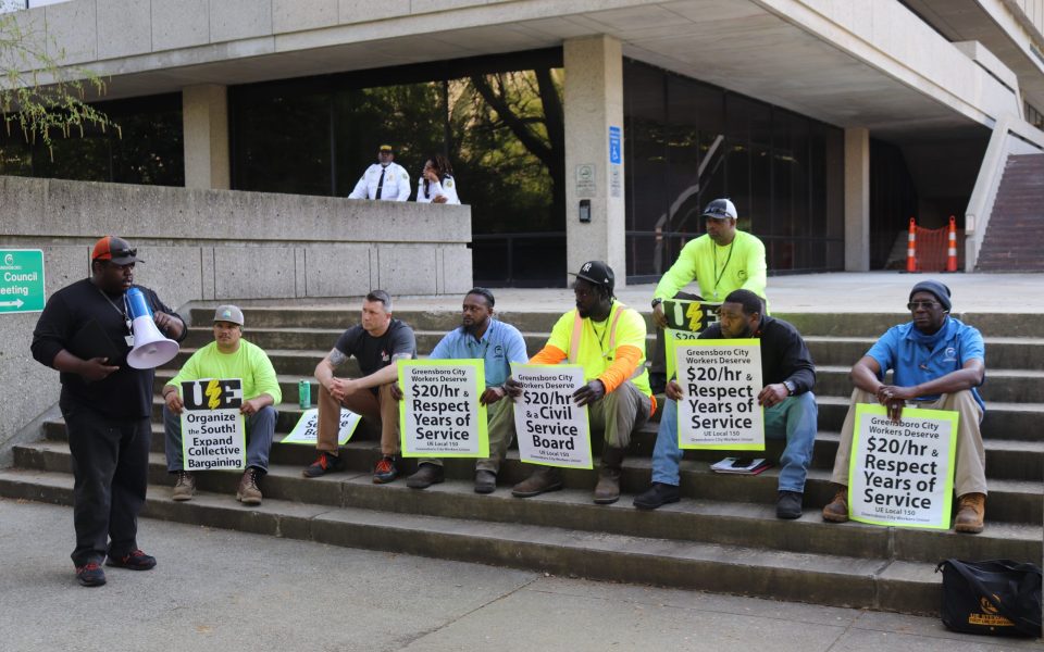 Featured photo: Workers with the city of Greensboro rally outside of the municipal building before an April 4 city council meeting. (photo by Gale Melcher)