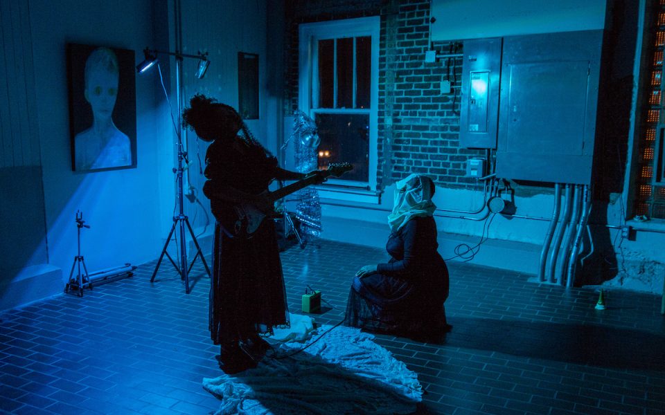 The smell of cigarette smoke oozing from an onlooker’s jacket wafted through the intimate crowd minutes later. A single aquamarine standing lamp shone from the corner of the otherwise dark Nite Gallery as a child’s voice stammered, “You can do anything,” leading into “Dance of the Sugar Plum Fairy.” Barefoot in a long black dress, Ash Williams knelt to gather a white pillowcase, placing it over their head to reveal large holes, and crept behind Amanda Medina, also in a black floor-length dress, who gathered most of her long hair into a high, loose bun and strapped on an electric guitar above patent-leather boots. The pillowcase now around her neck like an infinity scarf, Williams, armed with white string, fastened the tail to Medina and began winding the string around her performance partner’s body while dancing to Tchaikovsky’s ballet. Williams threw the ball of string at a man in the audience, chased it and continued encircling and ensnaring Medina as she silently strummed at the guitar in a trance-like state. Williams moved their fingers nimbly to match the occasional twinkling of high-pitched piano notes and tugged on the string last tied to Medina’s hair to the beat of the song, pulling the guitarist backwards as she appeared to finish a solo on a grand stage on her knees with triumphant bravado. Then she found a 10-inch knife, cut away string around the guitar and laid it down, yawning. Williams took the knife, covered Medina’s head in a pillowcase and an alarm goes off, beeping in synchrony with a white flashing light inside the pillowcase.
