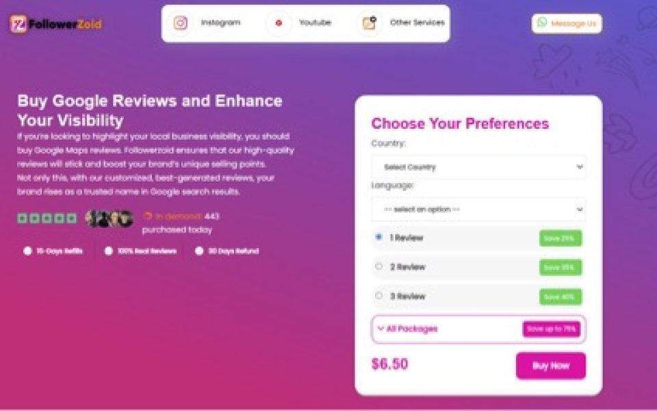 If you’re looking to make a lasting impression online, Followerzoid is a trustworthy, easy-to-use platform for buying real Google reviews. With fast delivery, high-quality genuine feedback, and friendly, knowledgeable support, Followerzoid helps your business move up in local searches and win more customer trust. If you want to grow your reputation the smart and honest way, Followerzoid is a great partner to help you get there.